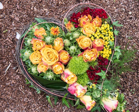 GdF_Vorsorge und Familie.jpg: Starke Symbolkraft haben Gestecke in Formen von Herzen, Engel oder Kreuzen. Foto: GdF, Bonn
